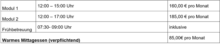Alle Preise sind auf 12 Monate umgelegt. Beginn und Ende eines Betreuungsjahres richten sich nach den Schuljahren. Daher beginnen alle Verträge grundsätzlich zum 01.08.